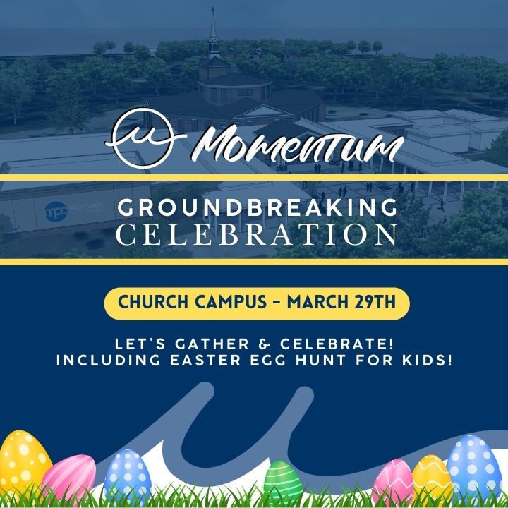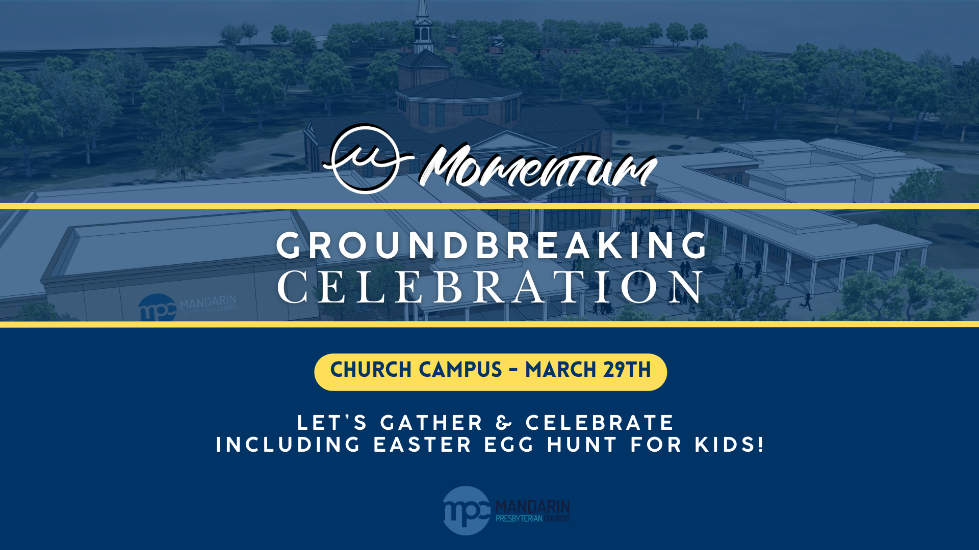 Mark your calendars and dust off your Momentum t-shirts — something BIG is happening! Join us Sunday, March 29th for ONE worship service at 10am, followed by a historic groundbreaking ceremony and a celebratory lunch together. This is a moment we've been praying and working toward, and we want everyone there to celebrate what God is doing at MPC!