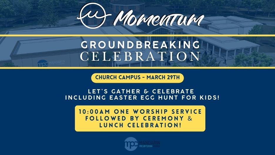 Mark your calendars and dust off your Momentum t-shirts — something BIG is happening! Join us Sunday, March 29th for ONE worship service at 10am, followed by a historic groundbreaking ceremony and a celebratory lunch together. This is a moment we've been praying and working toward, and we want everyone there to celebrate what God is doing at MPC!