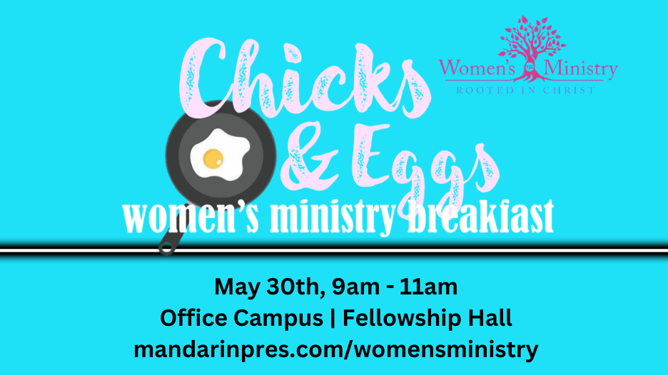Join us for Chicks and Eggs on Saturday, May 30th! Enjoy a morning of breakfast and fellowship with the ladies of our community. The event is $10, and childcare will be provided with prior registration by May 25th. Click here to register. We look forward to seeing you!