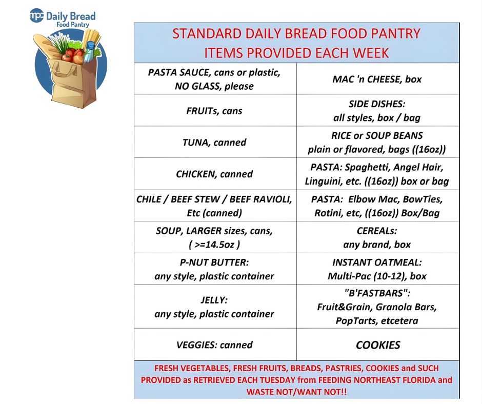 The Daily Bread Food Pantry at Mandarin Presbyterian was created to assist those families and individuals in need in our local area (Zip Codes served: 32217, 32223, 322257, 32258, and 32259).