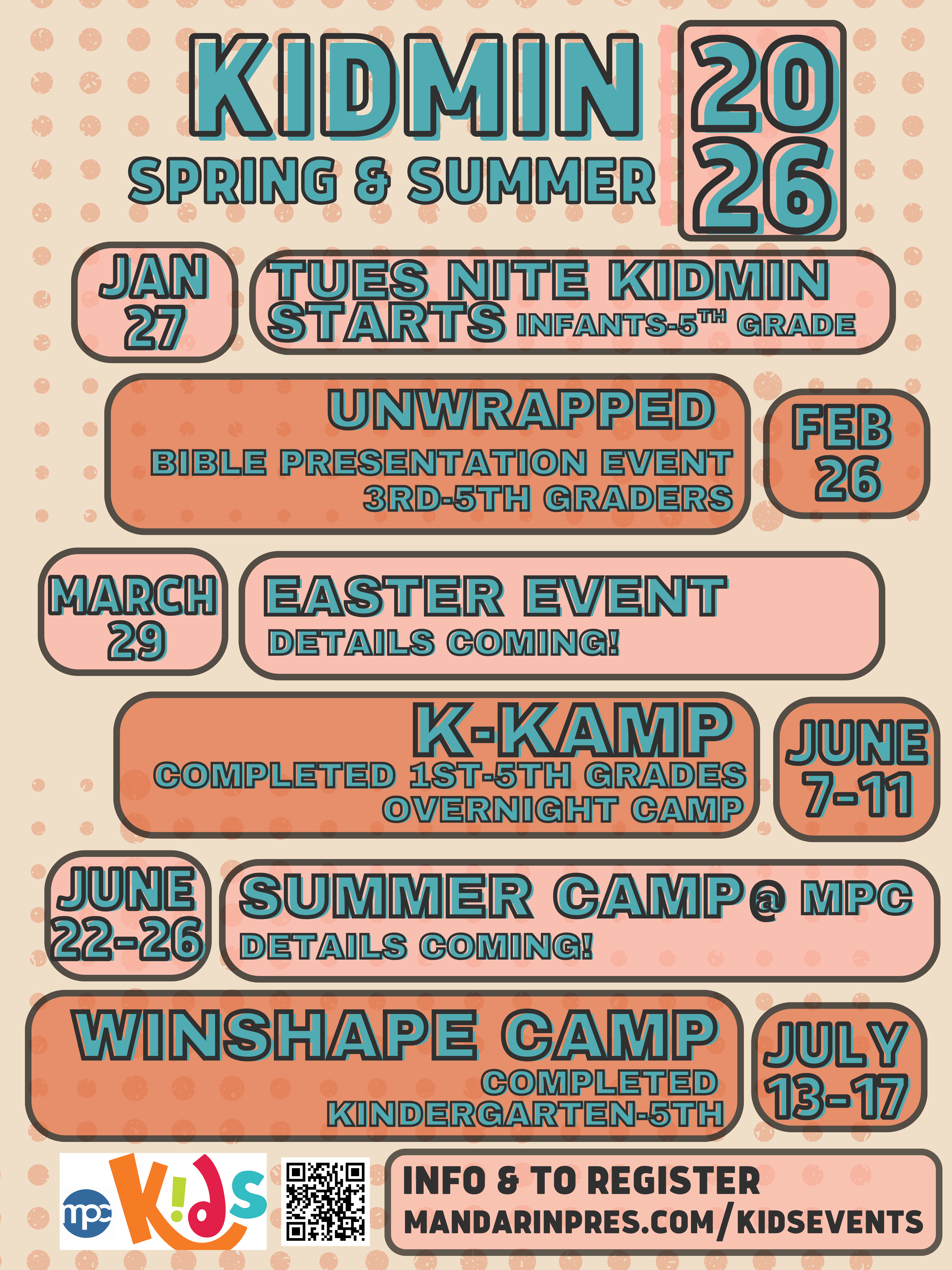 Click here to register for Tuesday night (6-7:30pm). We will have our Kids Ministry Program for birth-5th graders on Tuesday nights.
